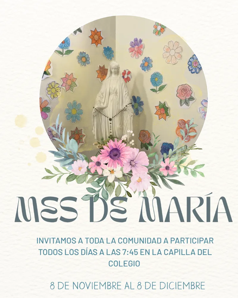 Mes de María 2025 Nov 7, 2025 Con mucha alegría queremos invitar a toda la comunidad escolar a la celebración del Mes de María en nuestro colegio. Los esperamos de lunes a viernes a las 7:45 hrs. en nuestra capilla. «Para empezar bien el día, ven al Mes de María»